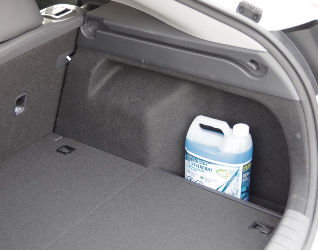 On retrouve dans le coffre de la Ioniq électrique à droite un rangement très pratique pour y placer un bidon de lave-glace ou autre.