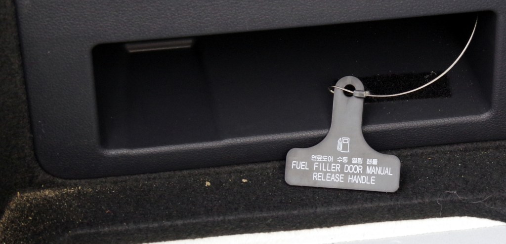 Dans le coffre à gauche, on retrouve un vestige de la Ioniq à moteur à combustion, avec une manette portant la mention « poignée de déverrouillage manuel de la trappe de remplissage de carburant ». Cette poignée exerce le même rôle, celui de pouvoir déverrouiller la porte du port de recharge, qui est située au même endroit. Très utile si le bouton au tableau de bord venait qu’à cesser de fonctionner.