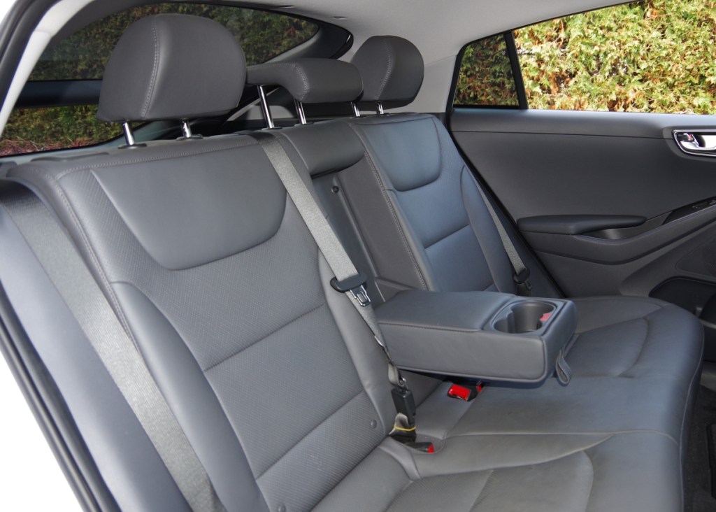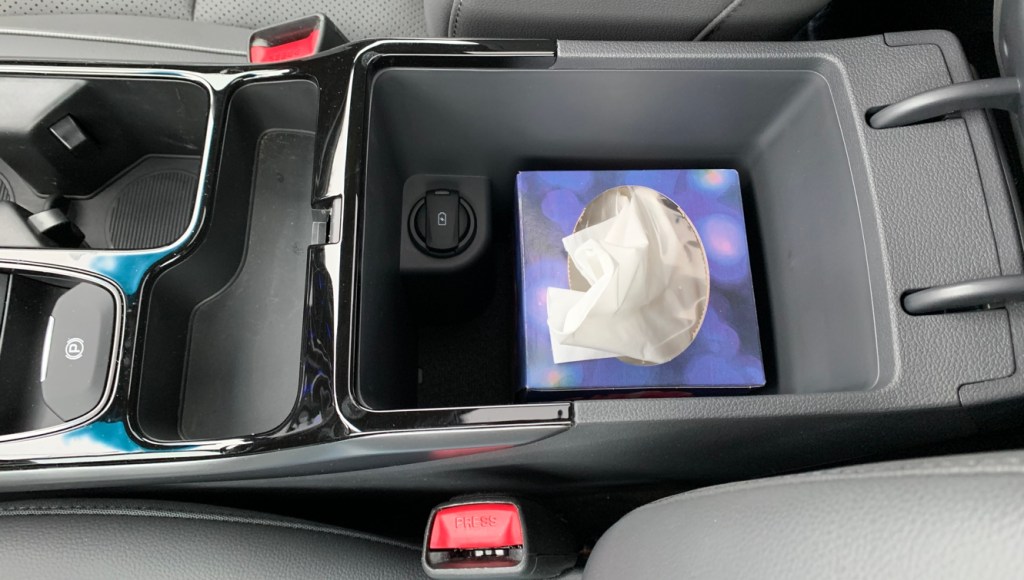 Les rangements sur la console centrale sont nombreux. Celui sous l’appui-bras dans la Ioniq électrique est légèrement plus petit que celui du Kona électrique, mais il offre une prise USB supplémentaire et suffisamment d’espace pour y ranger une boite de papier mouchoir.