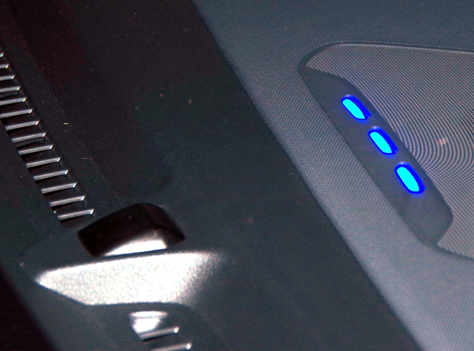 Sur la photo à droite, les 3 témoins lumineux bleus indiquant le niveau de recharge de la Ioniq électrique.