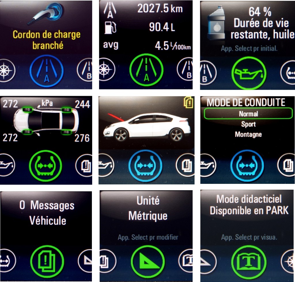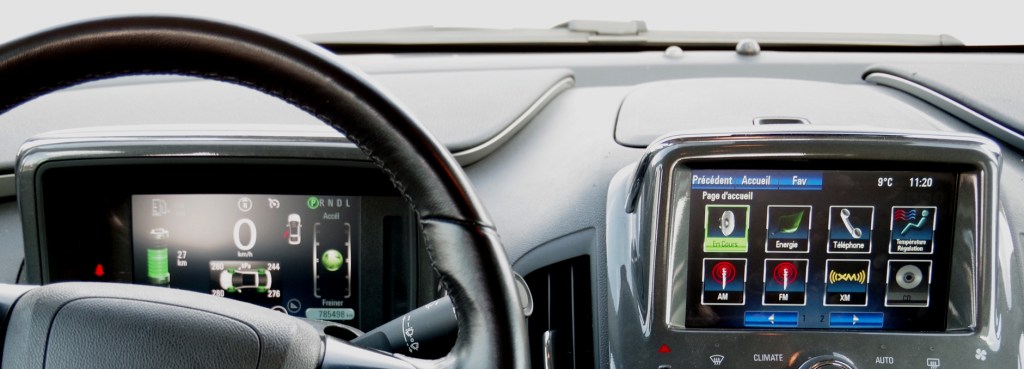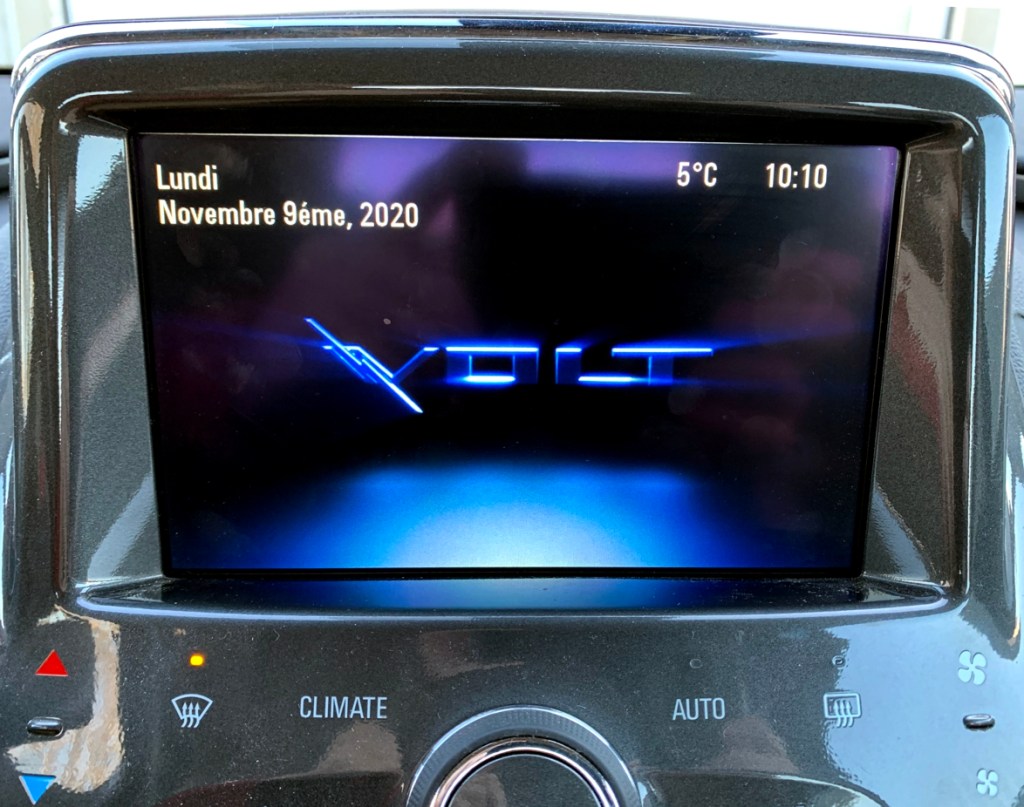 Lorsque la Volt fonctionne en mode essence, elle inverse ces deux images et accorde l’espace principale à la pompe à essence. La couleur verte ou bleue indique le niveau d’énergie ou d’essence restant.