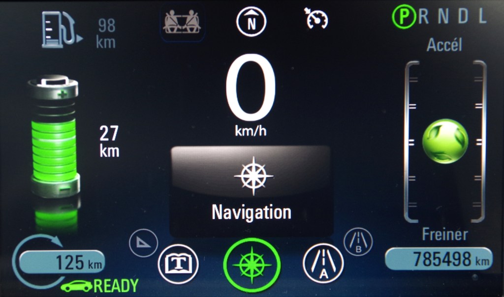 Selon l’utilisation du véhicule, lorsque celui-ci fonctionne en mode électrique, la batterie occupe l’espace du centre à gauche de l’écran et indique l’autonomie restante anticipée. En haut de la batterie, une pompe à essence indique l’autonomie restante avec l’essence.