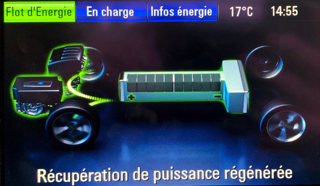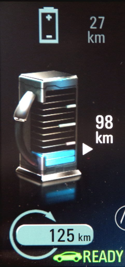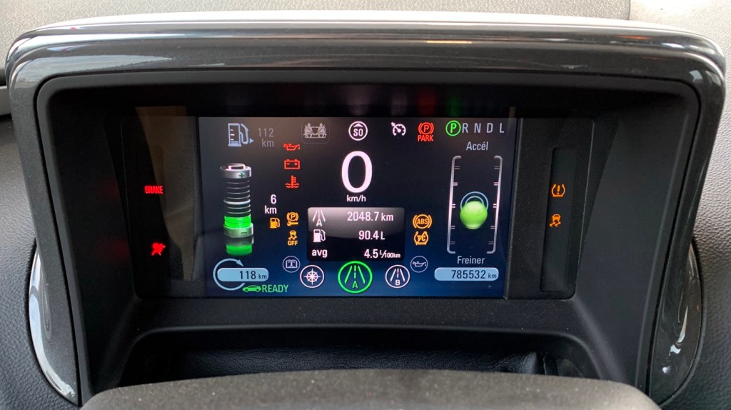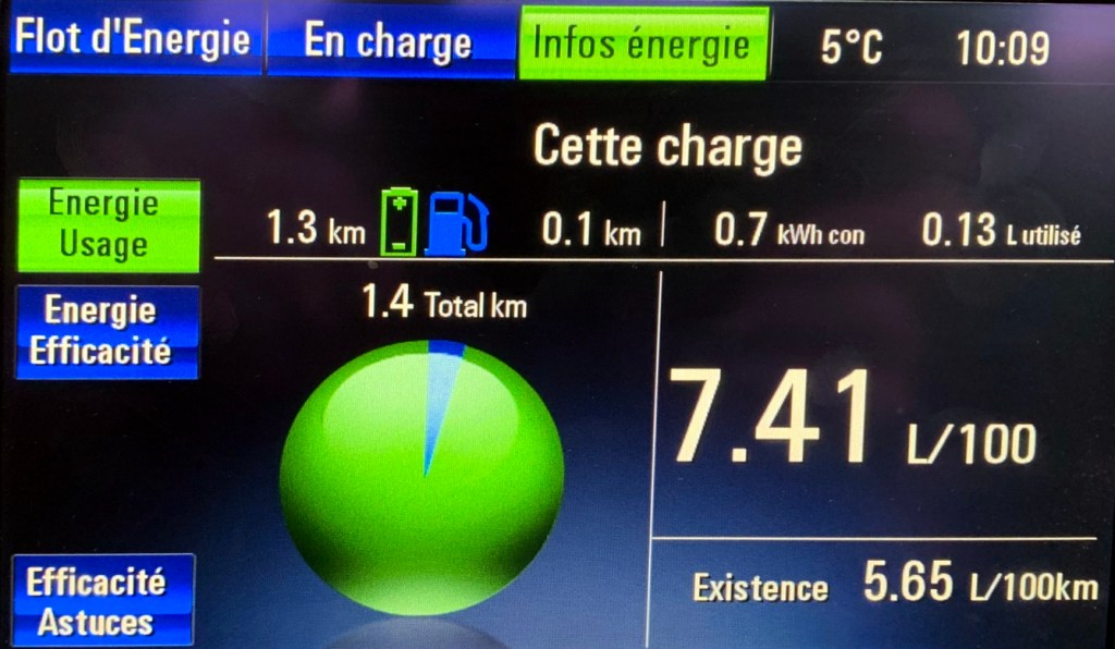 À titre indicatif, l’écran ci-haut donne un bon aperçu de la consommation d’énergie, qu’elle soit électrique ou sous forme d’essence. Dans le cas présent, nous pouvons constater que j’ai parcouru 1.4 km, dont 1.3 km en mode électrique (affiché en vert) et 0.1 km en mode essence (affiché en bleu). Si cela avait été un trajet normal, j’aurais consommé 7.41 L/100 km en utilisant 0.13 L d’essence et 0.7 kWh d’électricité.