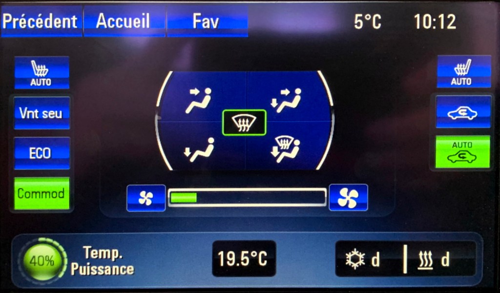 Sur le menu principal, on retrouve toutes les fonctions audio, de climatisation, de configurations et d’informations de la consommation d’énergie.