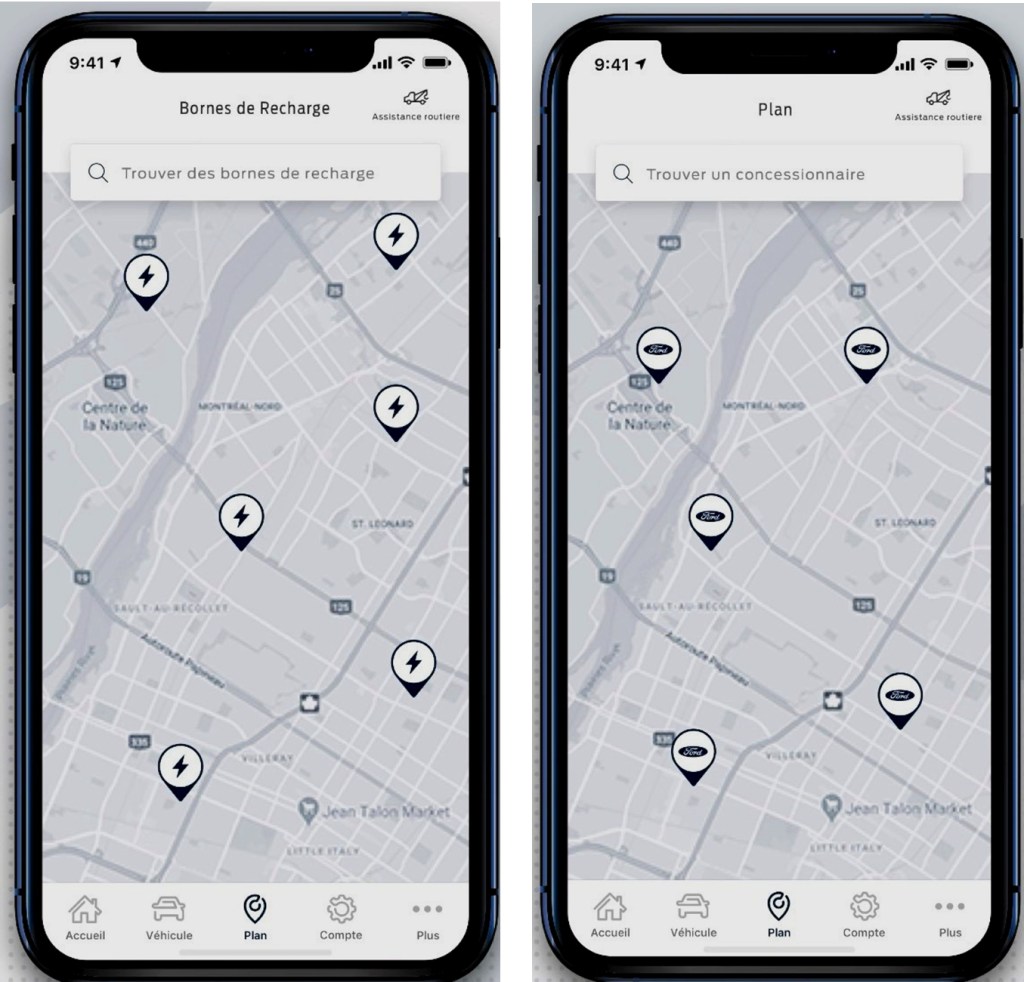 En plus de contrôler différentes commandes, de clavarder ou d’appeler l’assistance, le système permet également de localiser des bornes de recharge ou des concessionnaires Ford comme suit :