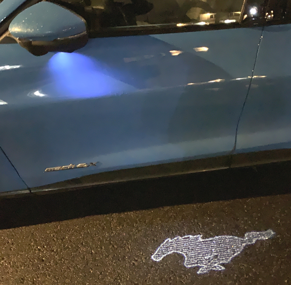 Avec le modèle à l’essai, la Mustang nous accueille avec un éclairage sous le miroir qui projette le logo de la Mustang au sol.