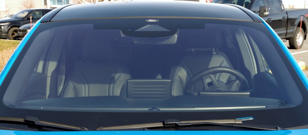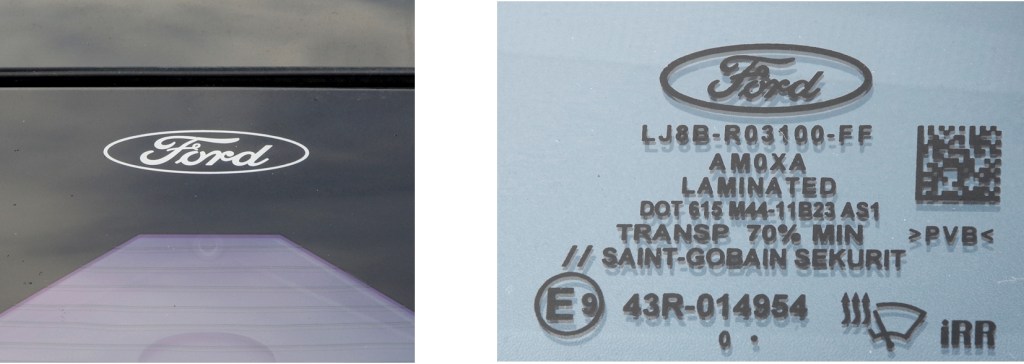 On retrouve seulement un petit logo Ford au sommet du centre du pare-brise et d’autres encore plus discrets dans les fenêtres et pare-brise en bas à droite.