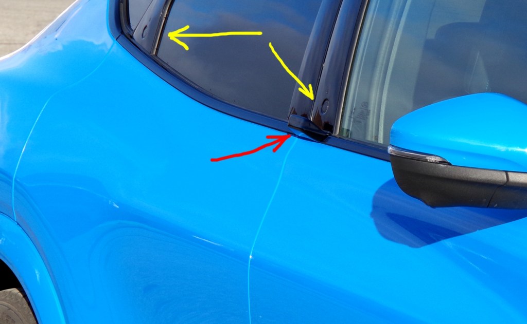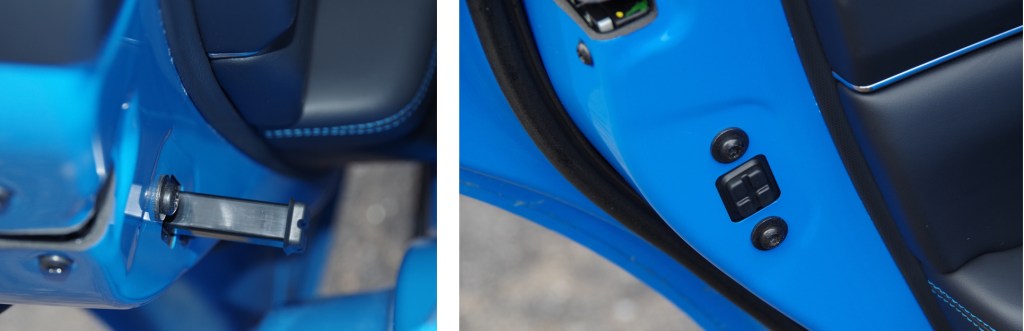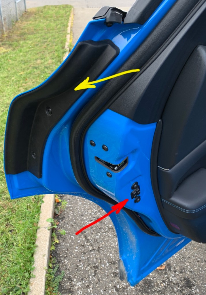 Sur la photo de droite, la flèche jaune indique la présence du revêtement pour saisir la porte arrière, tandis que la flèche rouge indique l’emplacement du marteau rétracté.