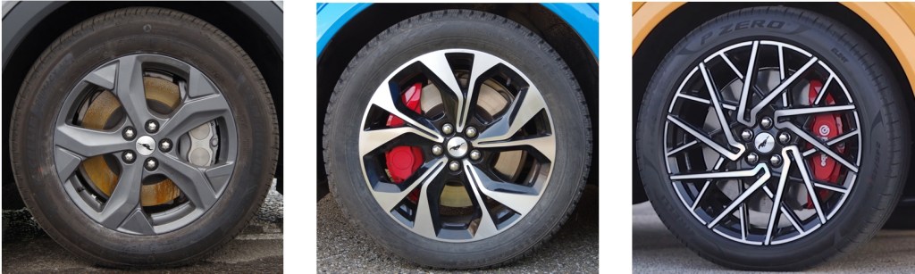 Pour la Mustang Mach-E, selon la version choisie, il est possible d’obtenir des roues de 18, 19 ou 20″ comme suit :