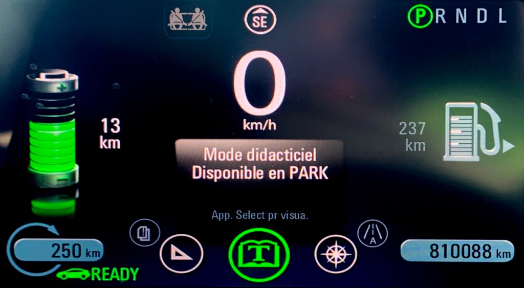 Certains diront que c’est trop peu, mais considérant qu’elle fut conçue à l’origine pour offrir une autonomie électrique de 56 km en conditions idéales (et non pas à -15o C) et que son kilométrage est actuellement extrêmement élevé, je dirais que c’est très bien.
