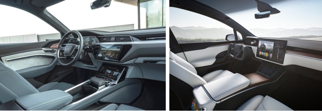 Disposant d’une instrumentation très épurée et non conventionnelle, les Tesla font plus futuristes et nécessitent un apprentissage initial pour s’y retrouver alors que ce n’est pas le cas avec les Audi e-tron et e-tron Sportback. Par exemple, dans la Model X, on ne retrouve plus de levier pour l’embrayage, pour les essuie-glaces et pour les clignotants, les commandes sont au volant ou à l’écran.