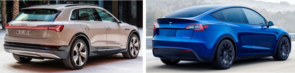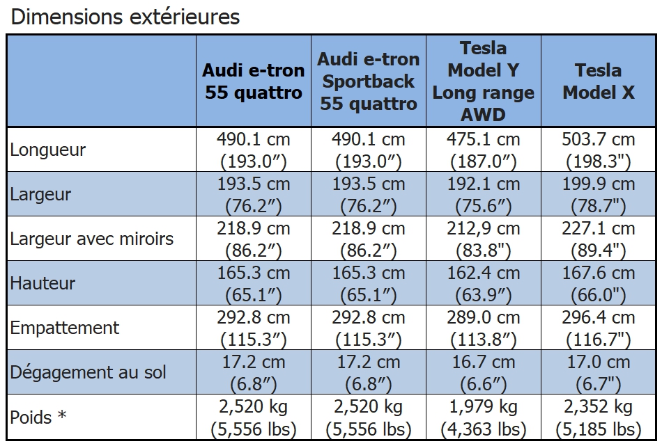 Si on se base sur le prix, les Audi e-tron devraient être comparées à la Tesla Model Y. Toutefois si l’on veut faire un comparatif à partir de ses dimensions, les Audi e-tron se situent quelque part entre les Tesla Model Y et X.