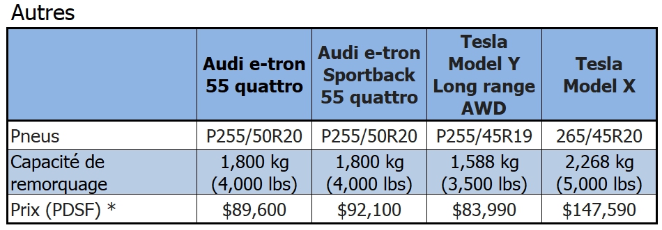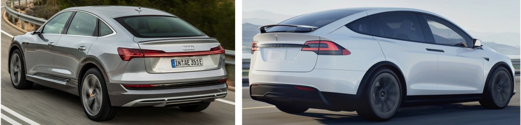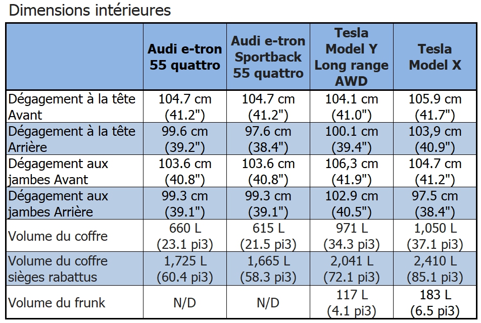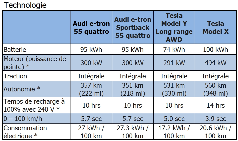 Comparativement aux Tesla Model X et Y, les Audi e-tron et e-tron Sportback offrent en plus des sièges ventilés, une meilleure insonorisation, un véritable toit ouvrant avec une toile solaire motorisée, un cache bagage complètement rétractable pour le coffre arrière, un affichage tête haute et bien d’autres commodités et possibilités selon la version et les options choisies.