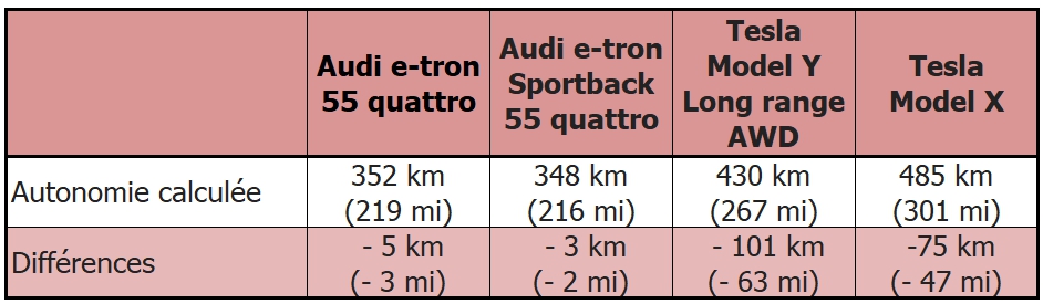 Par rapport au chiffres identifiés par Ressources naturelles Canada, avec les Audi on obtient un écart de seulement 5 et 3 km, ce qui est très réaliste. Toutefois avec les Tesla, on obtient un écart de 101 km pour la Model Y et 75 km pour la Model X, ce qui donne une marge d’erreur possible de 19% et 13% respectivement pour les Tesla, ce qui est considérable.