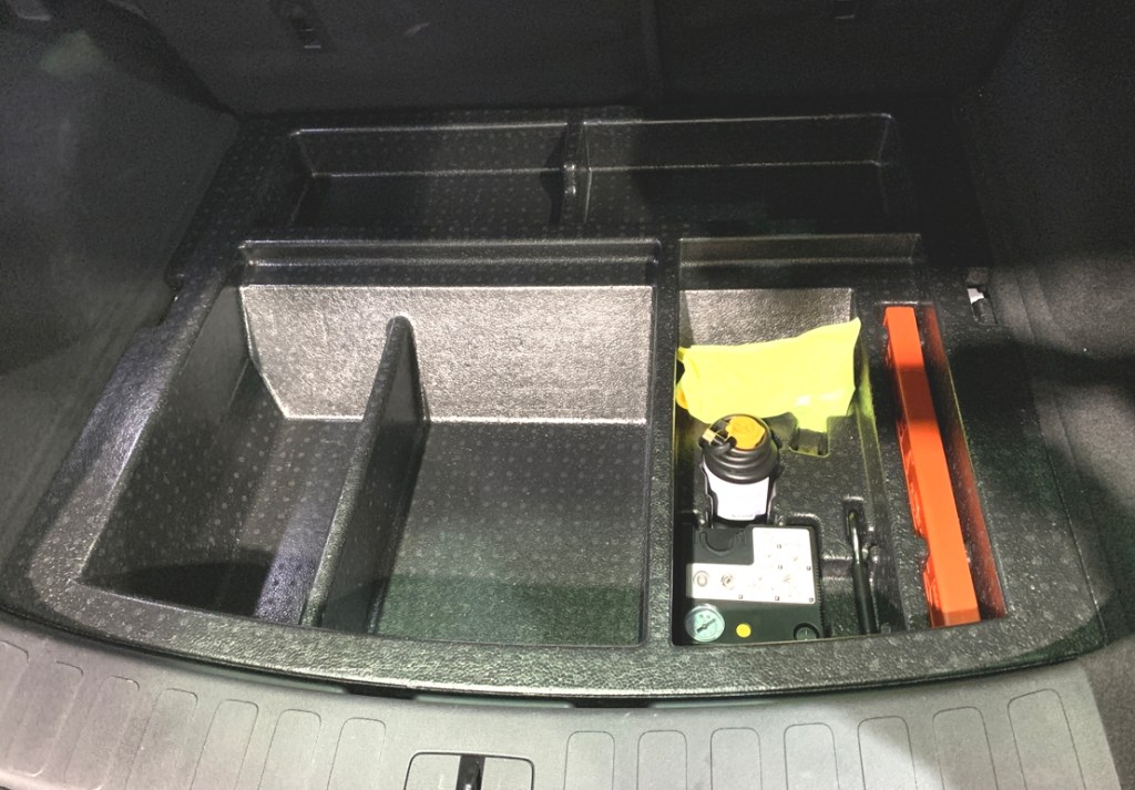 Ci-contre, le bac de rangement sous le plancher qui offre plusieurs compartiments pour y ranger différents éléments tel que la borne de recharge portative, le kit de réparation de pneus et autres.