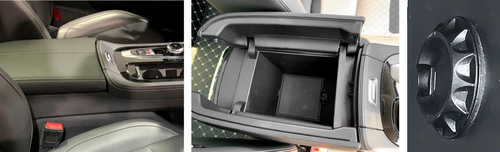 Ci-haut à gauche l’appui-bras, au centre lorsqu’ouvert et à droite la valve au fond du compartiment.