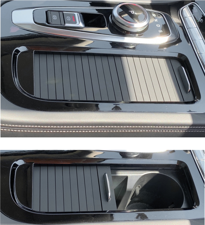 À droite de l’embrayage, on retrouve 2 porte-gobelets avec un autre petit rangement. Ce compartiment est refermable grâce à une porte coulissante (photos ci-contre).