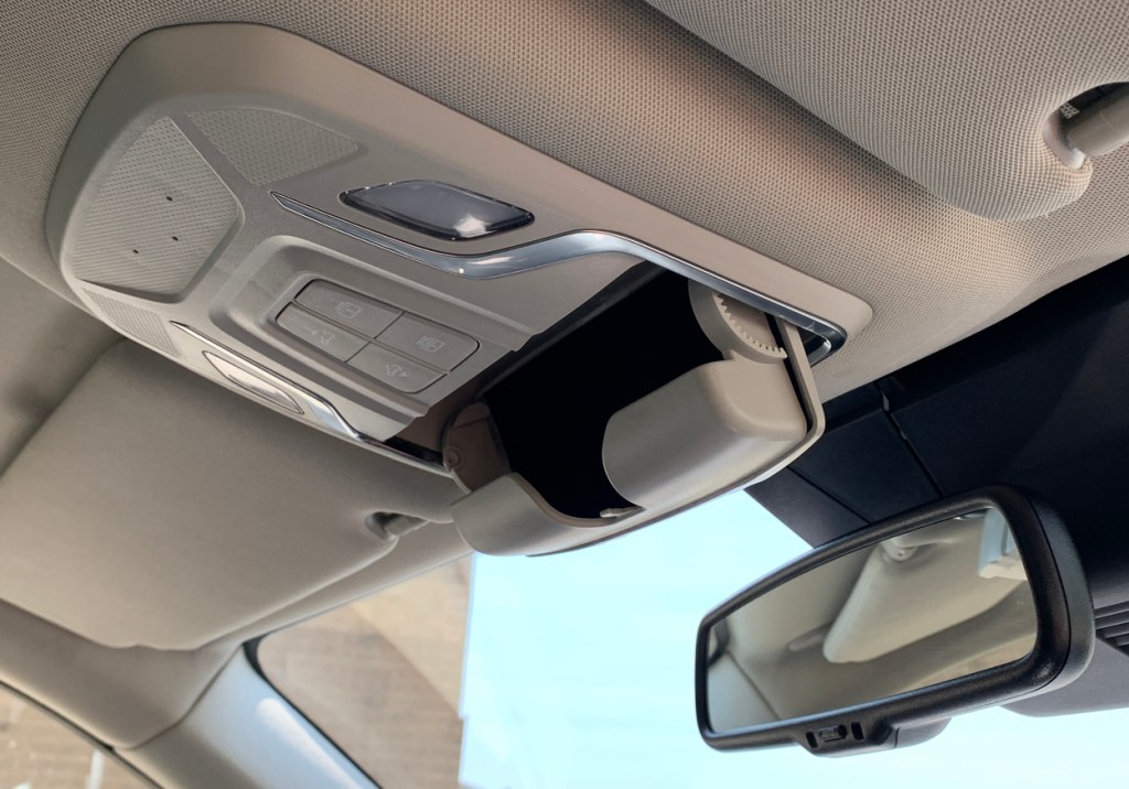 Au plafond, on retrouve une console qui comprend un éclairage de courtoisie, les commandes du toit ouvrant et de sa toile et un rangement pour lunettes. Le rétroviseur est électrochromatique dans la version « Limited ».