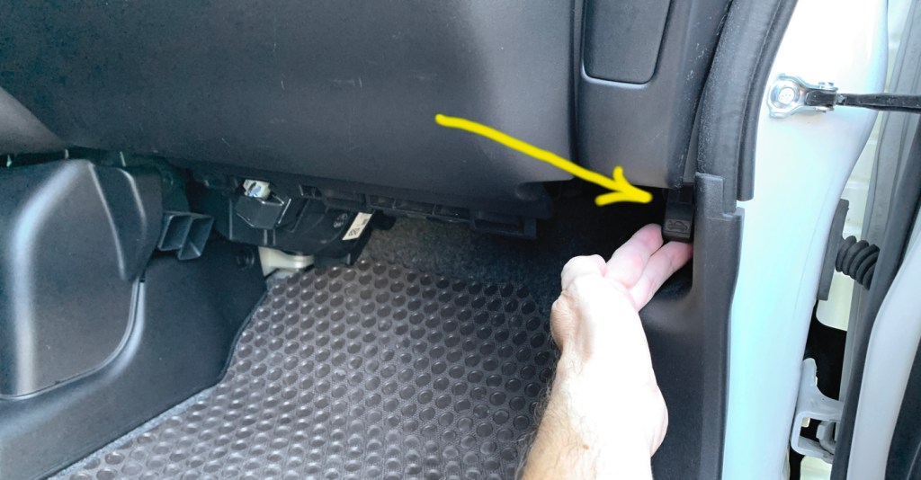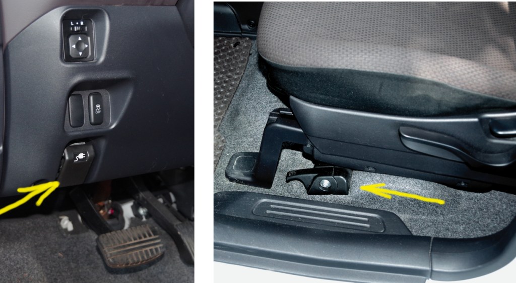Le levier pour l’ouverture du capot est dissimulé sous le tableau de bord près de la porte côté passager. Est-ce un vestige d’un véhicule qui a d’abord été conçu pour une conduite avec un volant à droite au Japon?