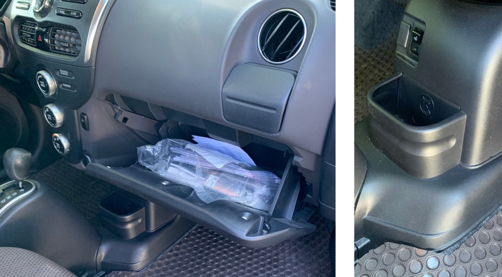 Les espaces de rangement sont peu nombreux dans la i-MiEV. Alors qu’il n’y en a pas dans la console centrale, on retrouve seulement un très petit rangement au plancher et un coffre à gants de format moyen.