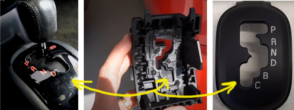 Ci-contre, à gauche la plaque de recouvrement de l’embrayage des i-ON et C-Zero. Au centre, on peut observer que sur la plaque de guidage du levier (qui est positionnée sous la plaque de recouvrement), le découpage des 2 dernières positions du levier de vitesse n’a pas été complété. Il suffit de les découper et de remplacer la plaque de recouvrement. À droite une nouvelle plaque de recouvrement de la i-MiEV pour l’Europe (Mode « B » et « C » au lieu de « ECO » et « B » en Amérique du Nord).