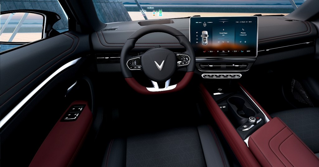 Ci-contre, le tableau de bord du VF7 en finition rouge vin. A souligner la présence d’affichage dans le pare-brise devant le volant.