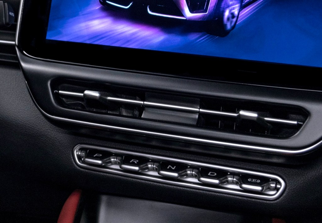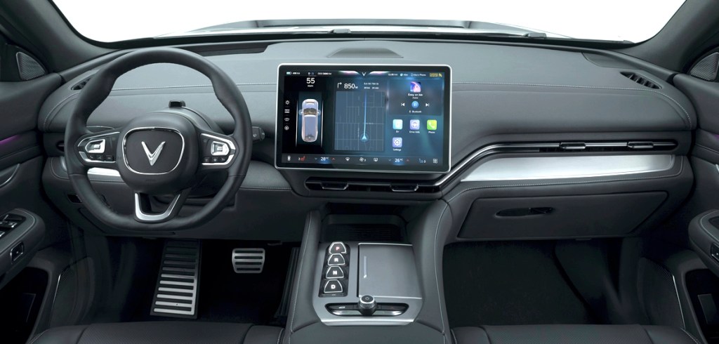 Ci-contre, le tableau de bord du VF8 en finition noire avec l’embrayage par boutons pression dans la console centrale.