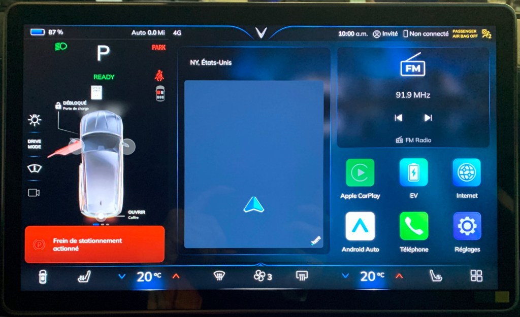 À gauche l’état du véhicule et quelques commandes, au centre la carte (qui ne fonctionnait pas au moment de l’exploration du véhicule), à droite l’audio et différents menus. Au bas, les contrôles de la climatisation double zone, les sièges chauffants et l’accès aux menus.