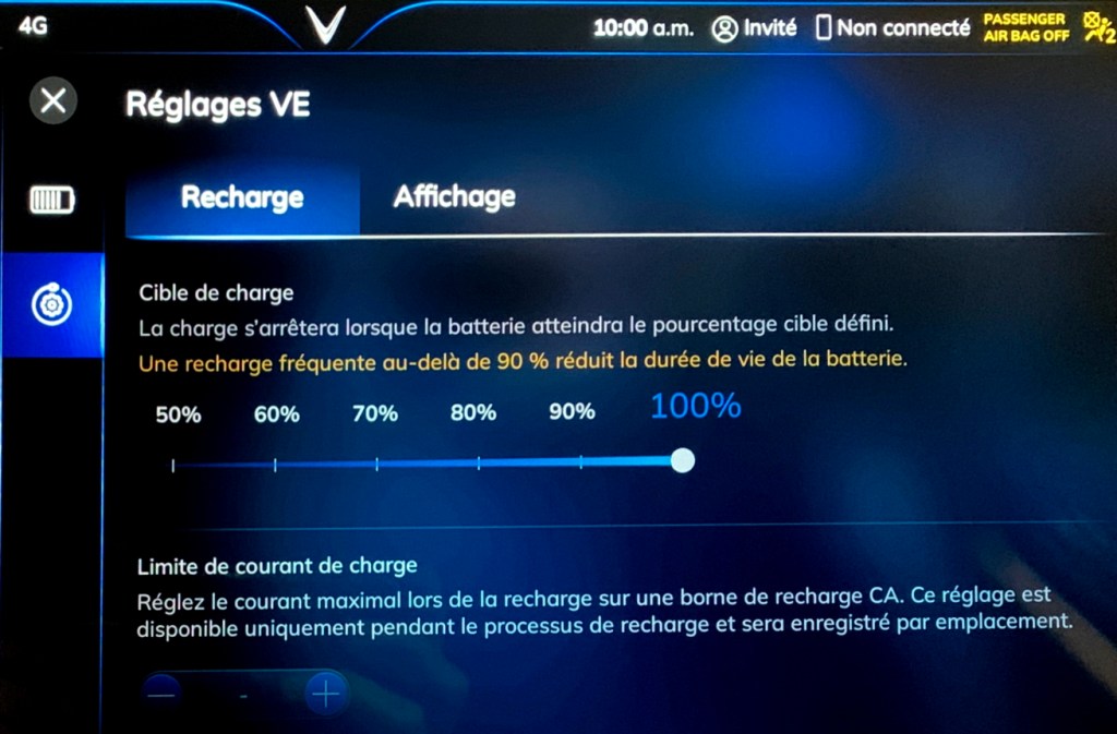 Il est possible de programmer différents éléments au niveau de la recharge, incluant le niveau de recharge et l’affichage de l’information VÉ à l’écran.