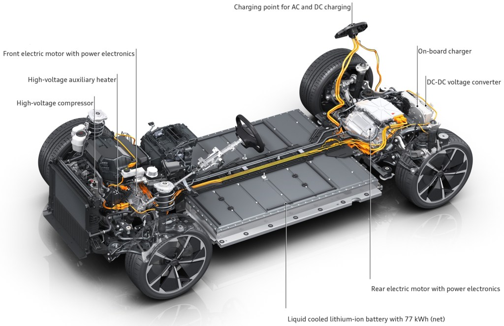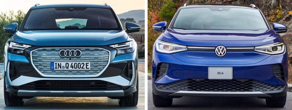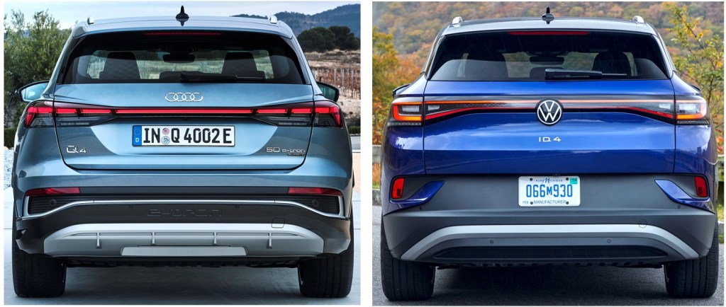 Audi, qui fait partie du Groupe Volkswagen, utilise la même plateforme « MEB » (photo ci-contre) dans sa Q4 e-tron que la Volkswagen iD4. Même chose en Europe avec la Skoda Enyaq iV (non disponible sur le continent nord-américain).