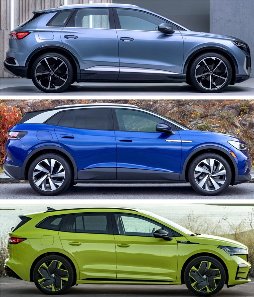 De dimensions similaires, ci-contre la Audi Q4 e-tron suivie de la VW iD4 et de la Skoda Enyaq iV.