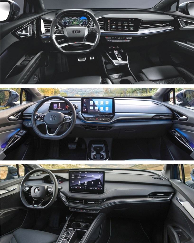 Ci-contre l’intérieur de la Audi Q4 e-tron suivie de la VW iD4 et de la Skoda Enyaq iV.