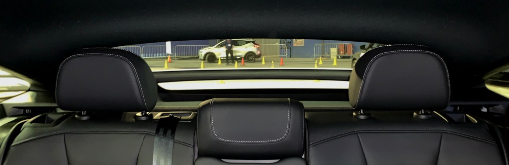 La version Sportback comprend un aileron qui obstrue partiellement la vision à l’arrière. Ci-contre, la vue avec l’aileron qui traverse la vitre arrière entre les 2 appuie-têtes.