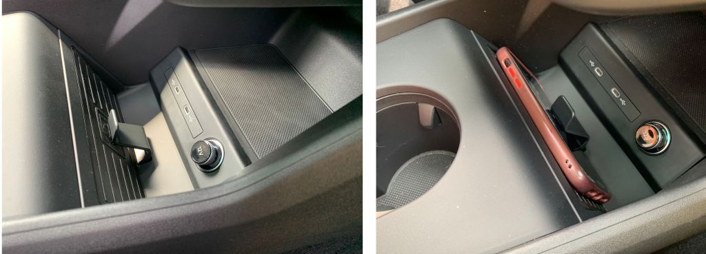 À l’intérieur de la console, on retrouve une recharge cellulaire positionnée à la verticale. Le téléphone étant retenu par une pince. Très pratique pour maximiser l’espace disponible. On y retrouve également 2 prises USB-C et une prise 12V.