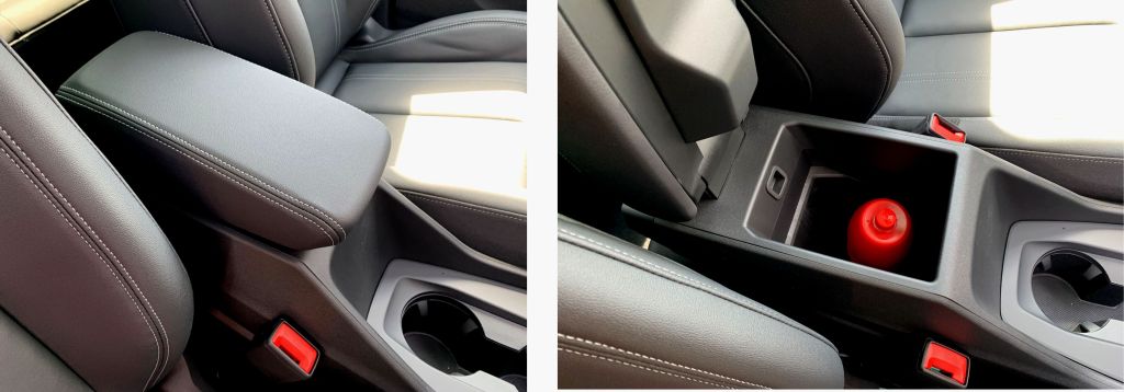 L’appuie-bras est très confortable et camoufle un rangement étroit et profond (à titre indicatif, la bouteille rouge mesure 19 cm (7.5″))