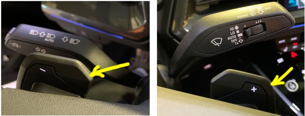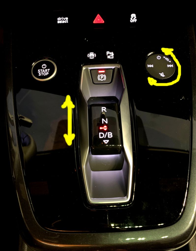 Derrière le volant se trouve 2 palettes pour contrôler manuellement la régénération d’énergie (indiquées en jaune). En mode conduite à une pédale, l’utilisation du frein est nécessaire pour immobiliser complètement le véhicule.
