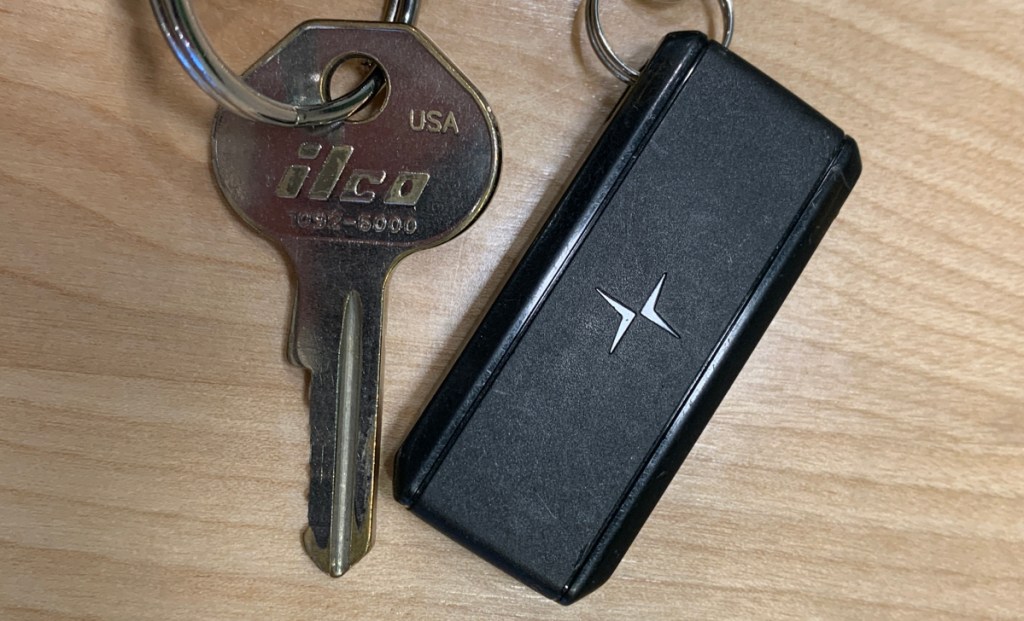 Le véhicule est équipé d’une petite clé à puce sans aucun bouton ni clé de secours mécanique à l’intérieur. Ci-contre, en comparaison avec une clé traditionnelle.