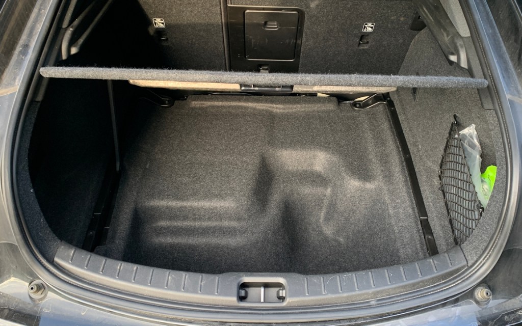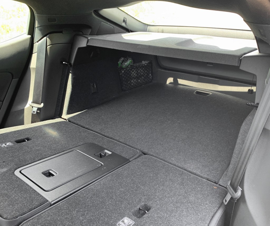 Lorsque la banquette est rabattue, on obtient un plancher plat avec 1,097 L d’espace de chargement. Sur la photo ci-contre, la banquette rabattue avec le cache-bagage rigide.