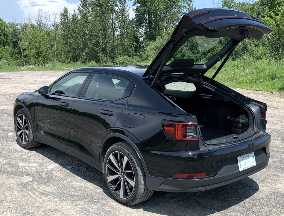Malgré qu’elle soit de style sedan, le coffre arrière de la Polestar 2 s’ouvre comme un hayon, ce qui permet de charger le véhicule avec de gros objets plus facilement.